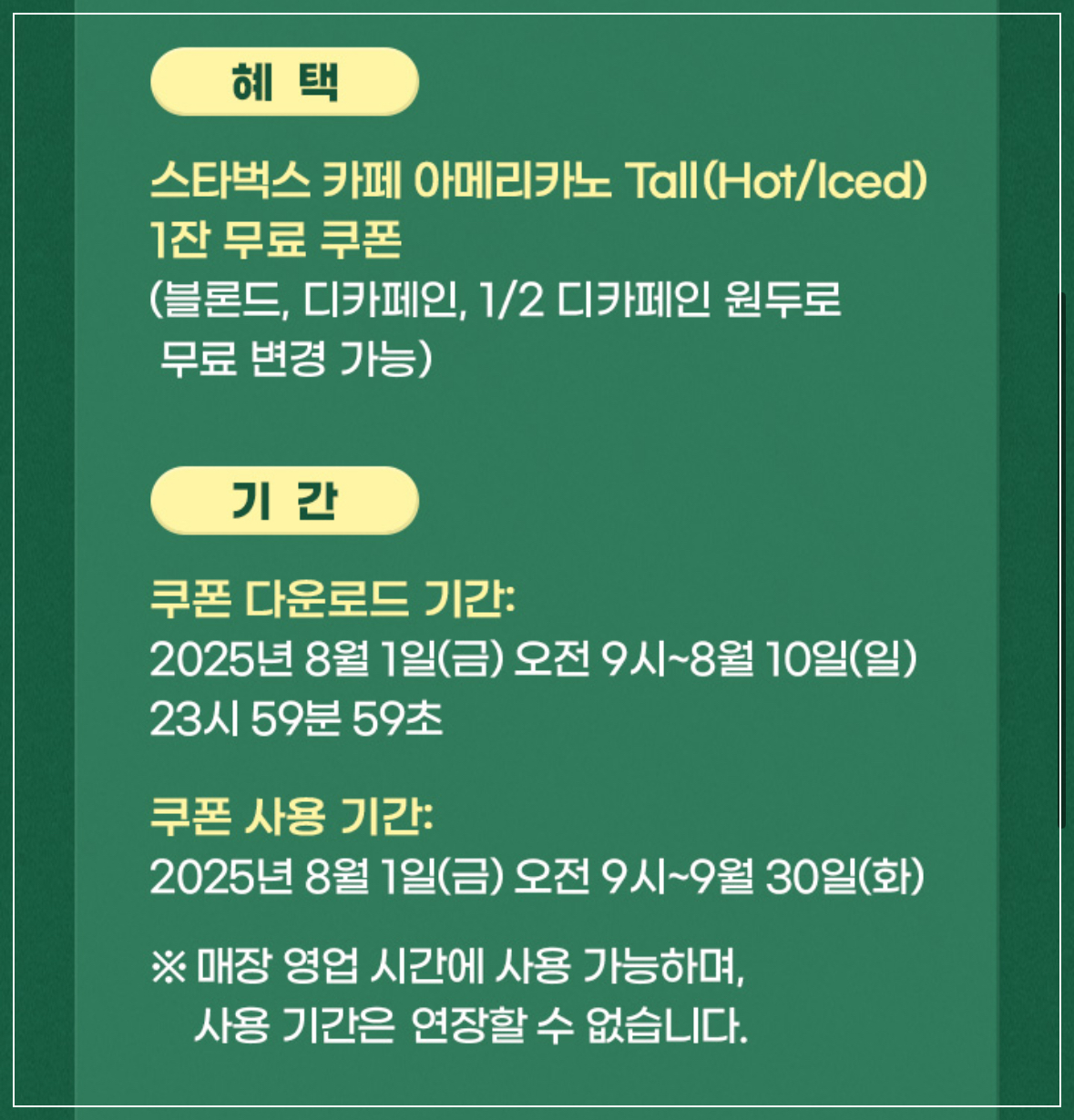 | 이용방법 | 쿠폰 다운로드 후, 직원에게 제시 (스타벅스 앱에 등록 사용 불가) |
