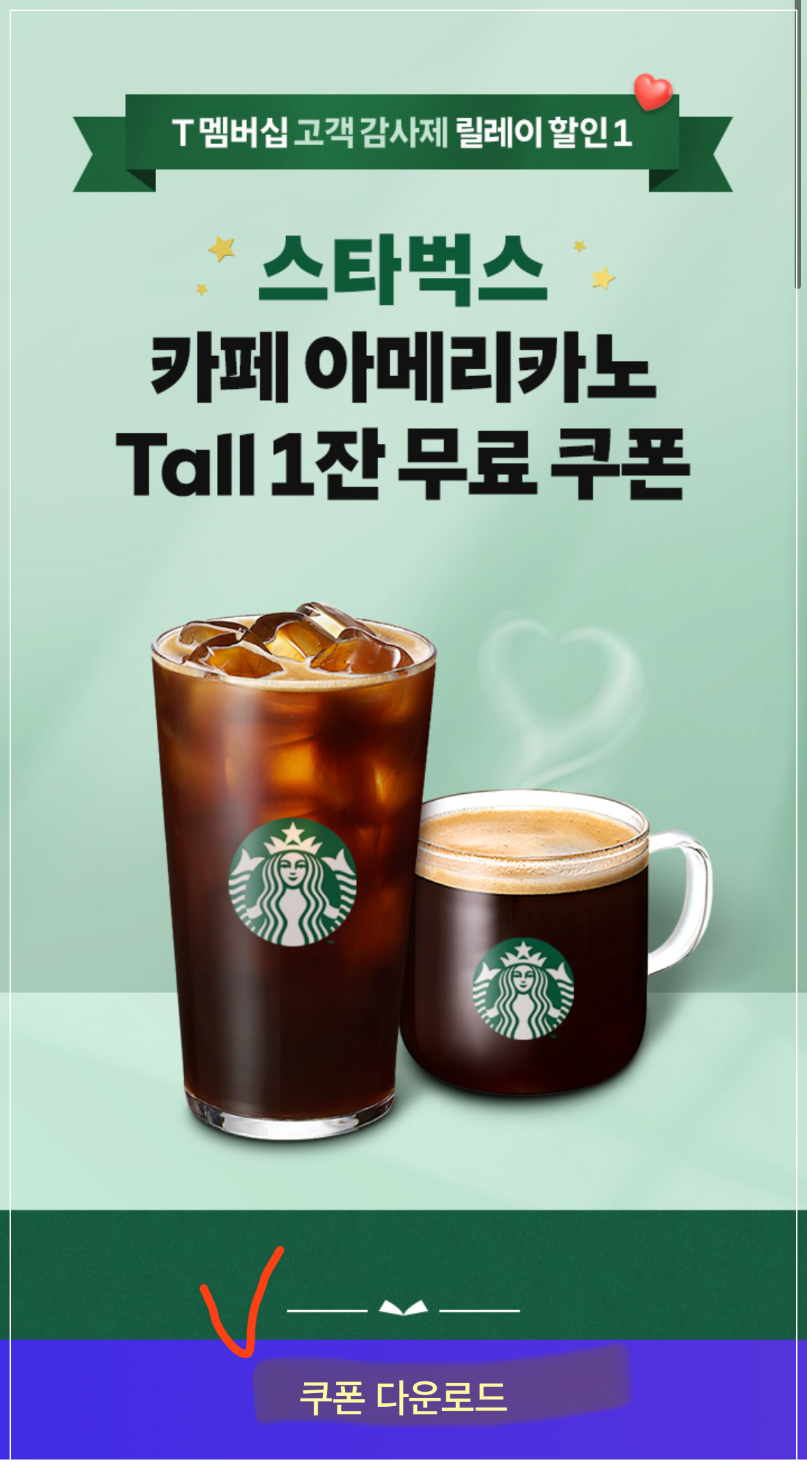 | 혜택 | 스타벅스 카페 아메리카노 Tall(Hot/ Iced)1잔 무료 쿠폰 |